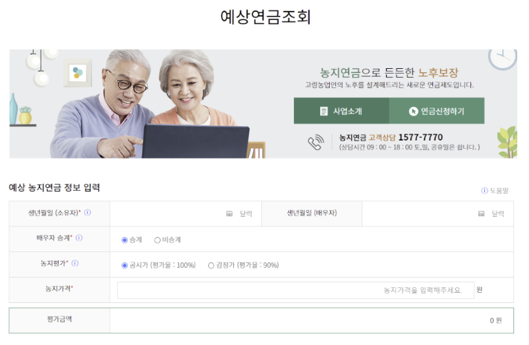 농지은행 홈페이지에서는 예상 연금 조회 서비스를 제공하고 있어, 농지의 가격을 입력하면 연금 종류별로 예상 연금을 조회할 수 있습니다.