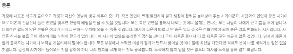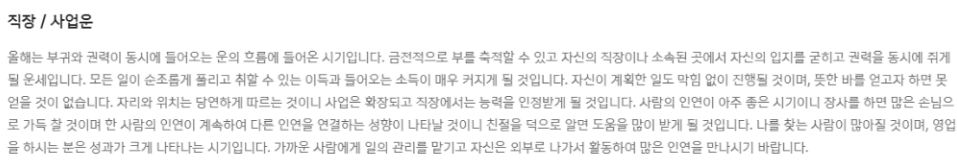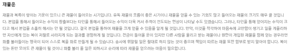 총론, 재물운, 직장운, 가정, 건강운등 다양한 운세를 이해하기 쉽게 정리가 잘 되어 있습니다. 무료운세 서비스이지만 유료 서비스 못지않은 운세풀이를 제공하고 있습니다.