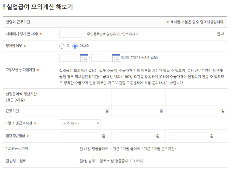 실업급여 금액 계산이 복잡하기 때문에 실업급여 모의계산은 고용노동부 홈페이지의 실업급여 모의계산 서비스를 통해 계산해 볼 수 있습니다.