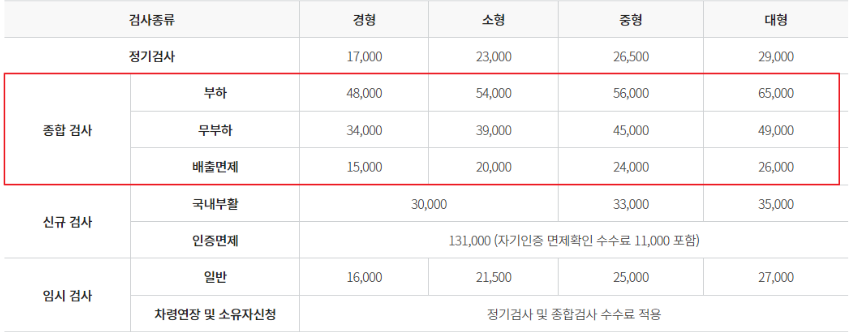 일반적으로, 정기검사의 경우 23,000원이며, 종합검사이 경우 54,000(부하), 39,000(무부하) 원입니다.