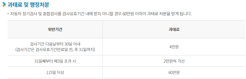 자동차 검사를 놓치면 과태료가 부과됩니다. 검사 기간일을 지났다면 30일 이내는 4만 원의 과태료가 부과됩니다. 이후 31일째부터는 매 3일마다 2만 원씩 과태료가 추가로 부과되며, 최대 60만 원까지 부과될 수 있습니다.
