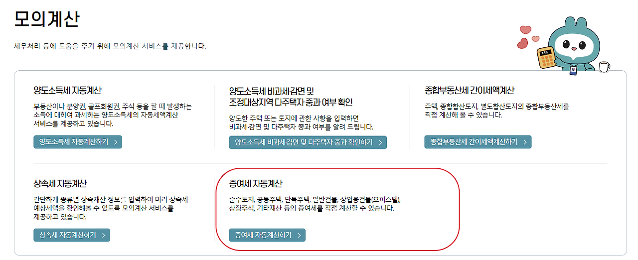 국세청 홈택스 증여세 계산방법으로는 홈택스 사이트에서 '세금 모의계산' 메뉴를 선택합니다. 이후 증여세 자동계산기를 선택하면 증여세 계산 화면으로 이동합니다.