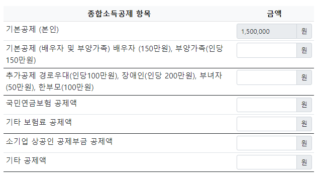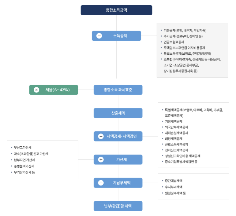 산출한 종합소득 금액에서 기본공제 (본인, 배우자, 부양가족), 추가공제 (경로우대, 장애인등)등 각종 소득공제를 통해 종합소득 과세표준을 산출합니다.