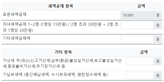 소득세 계산기에서 사업소득, 경비, 근로소득 등 해당하는 내용을 작성하고 공제받을 수 있는 항목이 있다면 정확하게 입력해 줍니다.